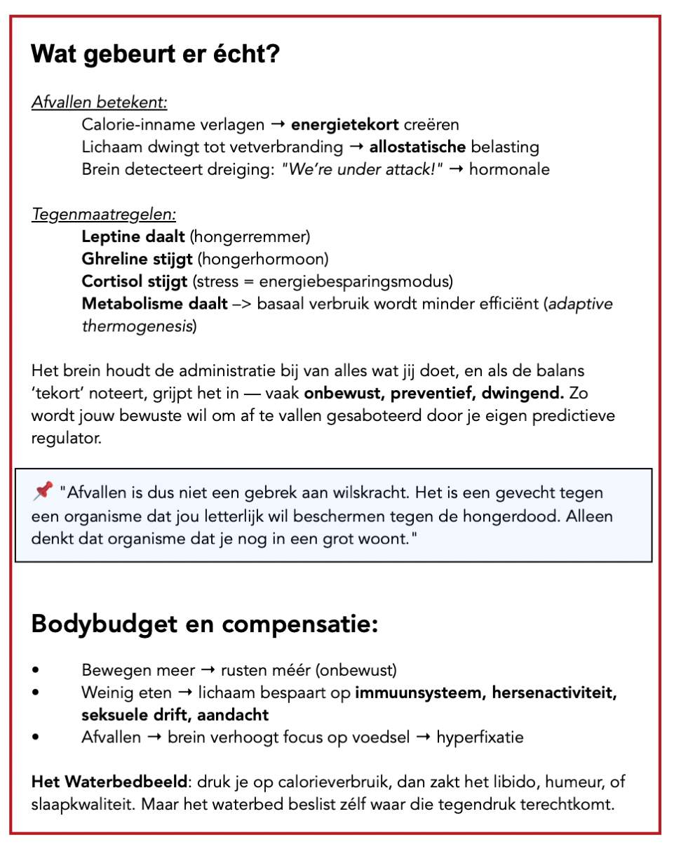 De enige duurzame weg is geen strijd, maar systeemhertraining. Ritmiek, slaap, stressverlaging, spieropbouw (niet calorieverbranding), zelfregulatie via langzame gewenning, in plaats van snelle tekorten. Een predictief systeem moet nieuwe voorspelbaarheid leren.